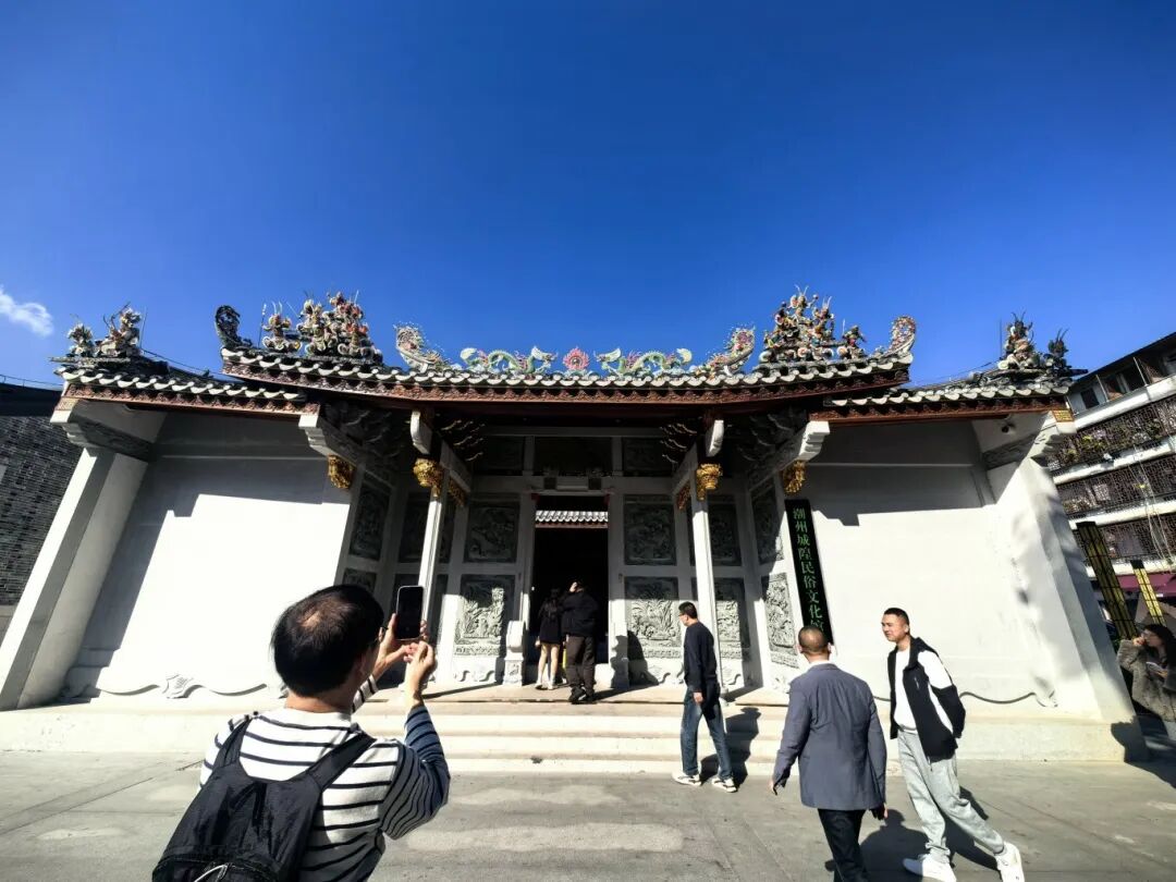 随后考察团前往潮州古城文化旅游区,实地调研了城隍庙、牌坊街、广济桥等历史文化地标,并沉浸式观看了英歌舞的震撼表演。在牌坊街非遗展示馆,考察团观摩了潮绣、木雕、工夫茶艺等活态传承场景,切身感受非遗技艺的独特魅力。在韩文公祠,考察团深入了解了韩愈治潮的历史功绩与民本思想,感悟其“欲为圣明除弊事”的家国情怀。潮州的行程让考察团深刻感受到了潮汕人民尚武崇文、昂扬向上的精神风貌。通过沉浸式体验,进一步启发了将红色教育融入文化情境的教学设计思路,为后续跨区域课程研发积累了素材。